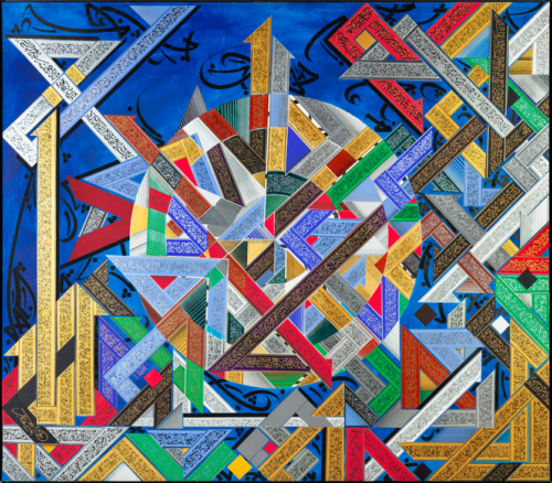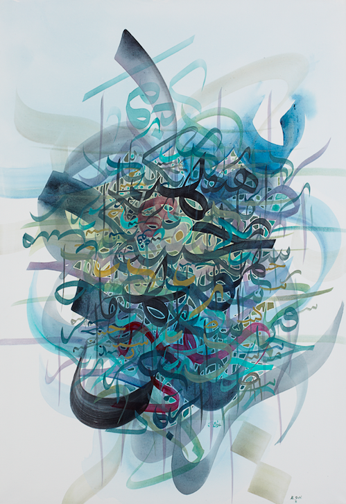 Khaled Al-Saai (b. 1970 in Homs, SY) lives and works between Beirut and the USA. He grew up in a family with a rich tradition of calligraphers. As a child, he learned classical Arabic writing styles and from 1989 onward studied calligraphy and painting at the University of Damascus and art history at the University of Aleppo, with subsequent study trips to Istanbul and Tehran, focusing on Ottoman and Persian calligraphy. Al-Saai’s work combines classical Arabic calligraphy with contemporary painting. His usually large-format pictures are composed rhythmically and dissolve script into abstract, overlapping color planes. Several works recall landscapes, others cosmic explosions in which letters seem like visual energy. For Al-Saai, language does not simply convey meaning but also expresses spirituality, movement, and music. The recognizable written symbols are either from poems or the Quran. In some cases, they lose their clear legibility—in favor of pure form and communicating emotions. He has received numerous awards for his calligraphy, such as those of the IRCICA, Istanbul (2007) and the Sharjah Calligraphy Biennial (2004, 2008). His works have been presented in exhibitions at the Institut du monde arabe, Paris (2001), Kunstmuseum Bonn (2005), and the Sharjah Art Museum (2007).