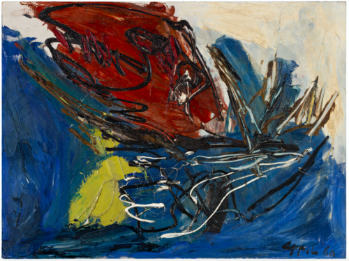 Karl Otto Götz (*1914 in Aachen, Germany; †2017 in Niederbreitbach, Germany) is regarded as one of the most important representatives of the German postwar avant-garde. After early self-taught works and a discontinued course of study at the School of Arts and Crafts in Aachen, he studied for one semester at the Academy of Fine Arts in Dresden before serving as a communications officer in Norway in 1941. As early as 1947, a British cultural protection officer arranged a solo exhibition for him in a Paris gallery. This led, in 1949, to his membership in the CoBrA group, founded in Paris – within which Götz remained the only German artist. In 1952, he co-founded the group Quadriga in Frankfurt. As a central figure of Informel painting, Götz understood contemporary art as a radical counter-concept to the ideologically appropriated art of the prewar era. He developed an open, rhythmically structured visual language of streaks and overlays of color, full of speed and energy. With this approach, he not only shaped the emerging abstraction of the 1950s but also influenced the atmosphere at the Düsseldorf Art Academy, where he began teaching in 1959 and had a lasting impact on generations of students – among them Gerhard Richter, Sigmar Polke, and Konrad Lueg. Götz’s works arise from rapid, gestural movements: liquid paint is applied, swirled, scraped, and reworked using squeegees, brushes, and spatulas in a controlled yet dynamic process. The canvas is often primed multiple times, sanded, and hardened – transforming the act of painting into an energetic intervention in space. No representation, but action: painting becomes a visual event. Götz’s oeuvre is permeated by calligraphic tension – not as writing, but as choreographed spontaneity. His pictorial language oscillates between structure and impulse, between lyrical rhythm and compositional precision. He was featured, among others, at documenta II (1959) and III (1964), and exhibited at the Museum of Modern Art, New York (1963), the Musée d’Art Moderne de la Ville de Paris (1965), the Kunsthalle Düsseldorf (1971), as well as in retrospectives at the ZKM Karlsruhe (2013) and the MKM Museum Küppersmühle Duisburg (2014).