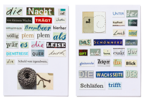 Herta Müller (*1953 in Nițchidorf, Romania) is a writer and collage artist. Since 1989, she has created poetic miniatures by arranging cut-out words from newspapers and magazines on index cards. The small format becomes a space of freedom: her “word collections” speak of language, resistance, and memory. Müller’s collages are both text and image, soundscape and stage. The Nobel Prize winner, shaped by exile and censorship, transforms language into a visual rhythm of rhyme and resonance—a subtle, persistent echo against forgetting, and a testament to the enduring power of expression.