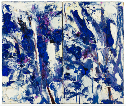Joan Mitchell (1925 in Chicago, US; †1992 in Paris, FR) was a painter of force and nuance. Her gestural visual language was rooted in physical discipline: as a teenager, she was an athletic all-rounder – a competitive diver, tennis player, figure skater, and rider – pursuits that instilled in her a strong bodily confidence that would later shape the structure and energy of her painting. After studying at Smith College and the School of the Art Institute of Chicago (BFA 1947, MFA 1950), she spent 1948–49 in France on a fellowship – a place to which she would later return permanently. In 1949, she moved to New York and became part of the city’s avant-garde. In 1951, she carried her own painting through the streets of Manhattan to the 9th Street Show – a gesture of self-assertion within the male-coded sphere of postwar American art. Mitchell’s work – monumental, often multi-panel canvases as well as smaller formats, pastels, and prints – translates spaces of memory and perceptions of nature into energetic architectures of color. Rhythm, density, and layering define her compositions; color serves as an emotional vehicle. Her painting is not abstraction in the classical sense, but a synesthetic language of seeing, feeling, and remembering. From the mid-1950s, Mitchell moved between Paris and New York before settling permanently in France in 1959. From 1968, she lived and worked in Vétheuil – once Claude Monet’s retreat – where she painted in seclusion in a compound of house, studio, and garden, surrounded by dogs, friends, and fellow artists. Her work has been shown in numerous major exhibitions, including the Stable Gallery, New York (1953–58); documenta II, Kassel (1959); the Whitney Museum of American Art (1974, 2002); the Musée d’Art Moderne de la Ville de Paris (1982); the Kunsthaus Bregenz and Museum Ludwig, Cologne (2015–16); and most recently at SFMOMA, the Baltimore Museum of Art, and the Fondation Louis Vuitton, Paris (2021–22).