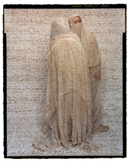 Lalla Essaydi (born 1956 in Marrakesh) is a Moroccan-born artist who lives in New York and works between Boston and Morocco. In her photography, paintings, installations, and films, she weaves together personal memories with reflections on the cultural, social, and political realities of her background. Raised in a privileged Muslim family, Essaydi lived in Paris and Saudi Arabia before studying painting at the École des Beaux-Arts in Paris, and later earning a BFA (1999) and MFA (2003) in painting and photography from the School of the Museum of Fine Arts at Tufts University in Boston. Her work critically engages with Western Orientalism and cultural stereotypes, especially in the representation of Arab women. In series such as Les Femmes du Maroc and Converging Territories (since the early 2000s), she stages women in calligraphically inscribed garments and interiors, using henna—a medium traditionally associated with women—to create visually sumptuous yet subversive explorations of gender, representation, and power. Essaydi’s works have been exhibited internationally, including at the National Museum of African Art, Washington, D.C. (2015), the San Diego Museum of Art (2017), and the National Museum of Women in the Arts, Washington, D.C., and are represented in numerous major U.S. museum collections.