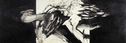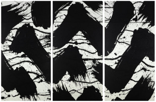 Yū-ichi Inoue (1916 – 1985), who worked as a primary school teacher in Tokyo throughout his life, was a trained calligrapher and heard about the main currents of abstract art in the USA and Western Europe. In the mid-1950s he developed his own technique with broom-like brushes made from tufts of dry grass. The idea was to create legible characters with the maximum artistic energy. From 1954 on, his large-format ink paintings were presented in many museum exhibitions that compared Japanese calligraphy with Western abstraction.