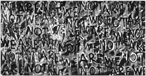 Adam Pendleton (*1984 in Richmond, Virginia, USA) lives and works in New York. After leaving the Art Institute of Chicago before completing his studies, he participated in an independent study program in Pietrasanta, Tuscany, before moving to New York in 2002. There, he developed an artistic practice that radically intertwines political history, language, and visual systems. Pendleton’s work is interdisciplinary—painting, silkscreen printing, video, text, collage, and performance overlap in conceptual processes grounded in the principle of montage. Language, texture, copies, symbols, and gestural marks merge into shimmering black-and-white compositions, occasionally interrupted by metallic or monochrome color accents. Formal opposites—positive/negative, surface/depth, voice/silence—are made visible, though never resolved. Since 2008, Pendleton has described his practice as Black Dada—a visual, poetic, and political vocabulary weaving together Dadaism, pattern strategies, African American theory, and visual codes. Black Dada functions as a rhythmic system of repetition, variation, and intervention, resonating with the logics of dub, rap, or West African textile design. In series such as Untitled (WE ARE NOT), typography is layered, cut, sprayed, and rhythmically arranged in an all-over effect. Meaning emerges relationally—between fragment and resonance, gap and repetition, deconstruction and recontextualization. Writing becomes an open composition: legible, audible, yet never fixed. The collective “we” is also put into question—not as a stable identity, but as a dynamic structure of shared multiplicity and shifting voices. Pendleton’s work has been shown at Performa, New York (2007); the Venice Biennale (2015); Museum of Contemporary Art, Chicago (2016); the Museum of Modern Art, New York (Who Is Queen?, 2021); Tate Liverpool (2022); mumok, Vienna (2023/24); To Divide By at Washington University, St. Louis (2023/24); and most recently at the Hirshhorn Museum, Washington, D.C. (2025/26).